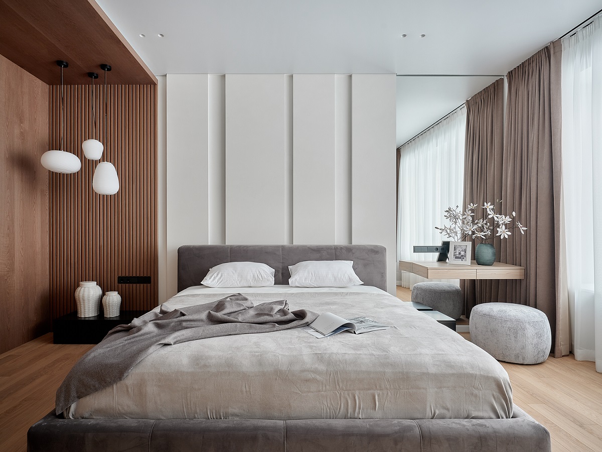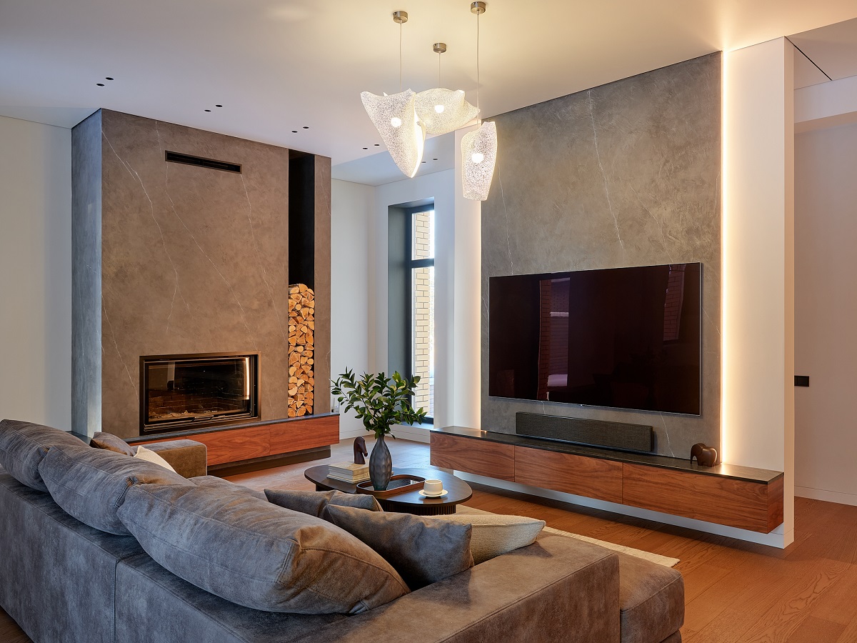 Палубная укладка разных по длине плашек из натурального дерева на прочной основе каменно-полимерного композита может быть выполнена по направлению света от окна (классический способ), перпендикулярно этому свету (если есть задача вытянуть комнату) или по диагонали.